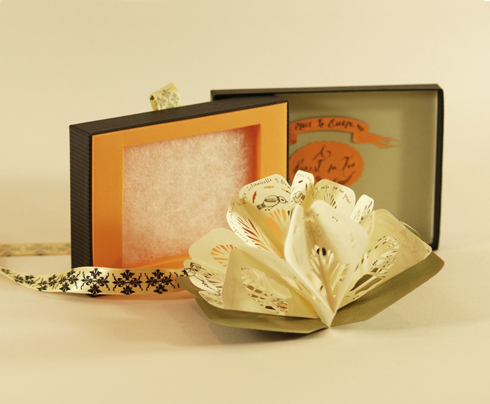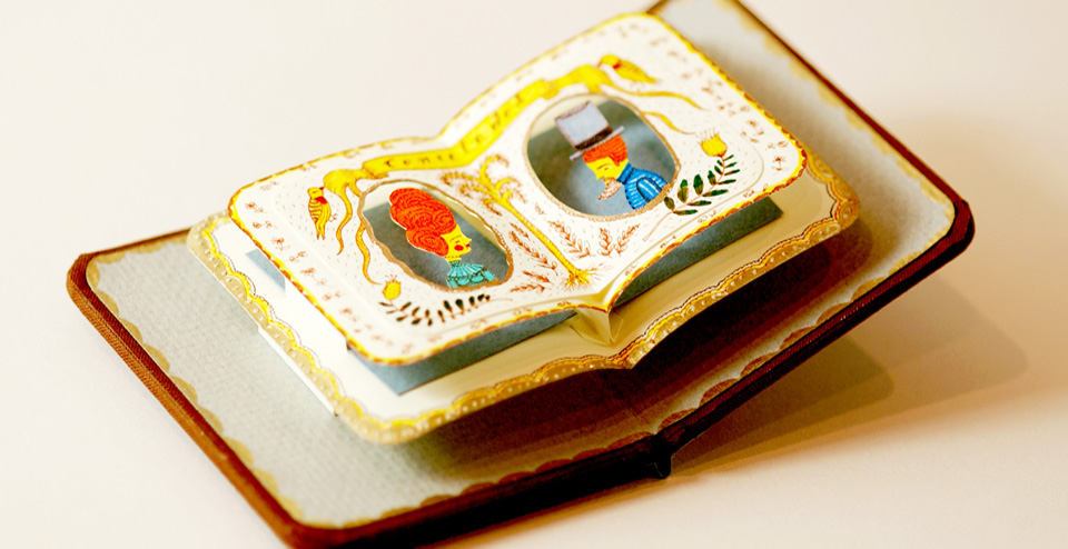 Chacun d’eux est présenté dans une ravissante pochette ou boîte, enrubannée avec souvent des pages en accordéon qui s’ouvrent sur de minuscules feuilles où dessins, adorables personnages et papiers découpés nous entraînent dans un univers à part qui fait travailler notre imagination.