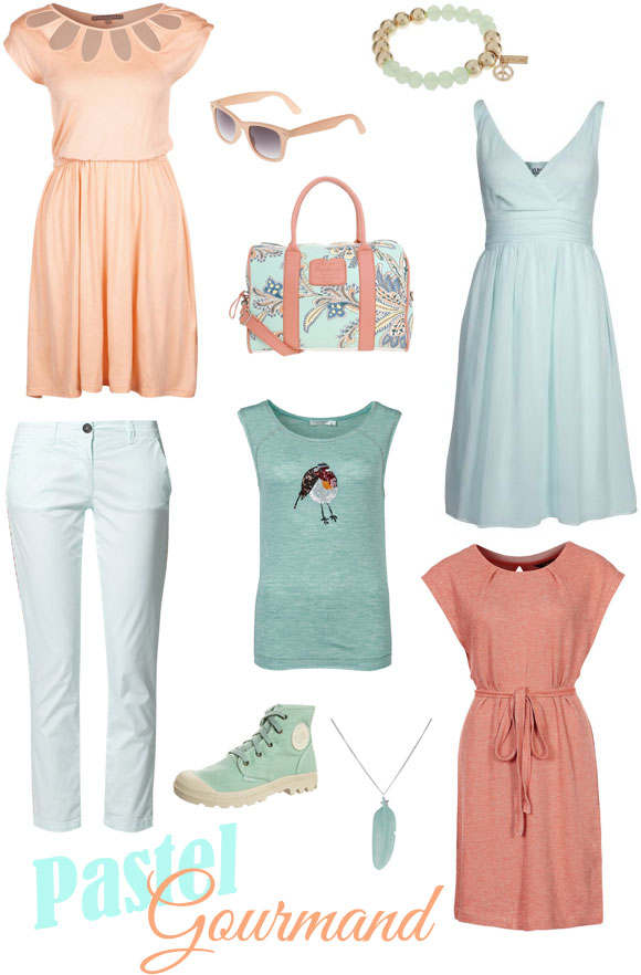 Je me suis ainsi amusée à repérer de jolies pièces que j’aimerais beaucoup porter quand les beaux jours arriveront à partir du site Zalando qui parle bien des tendances mode actuelles, dont le pastel gourmand. Si je ne dis pas non à quelques morceaux vert amande, lilas ou jaune pastel, j’ai sélectionné des couleurs exclusivement dans les teintes de pêche et turquoise; clin d’œil au blog !