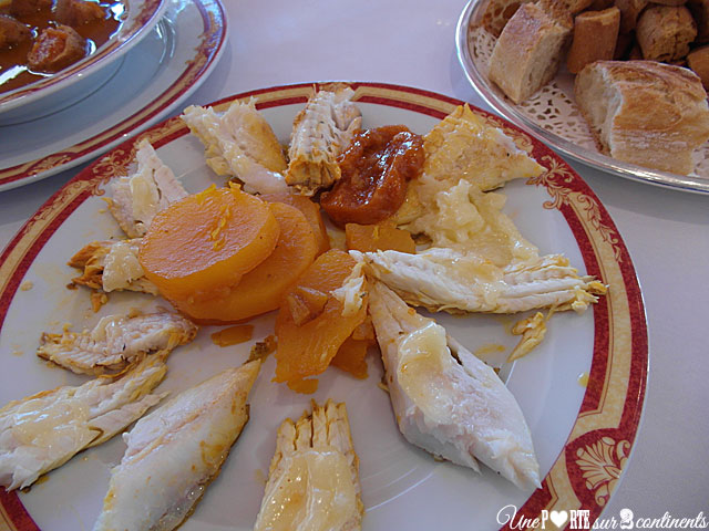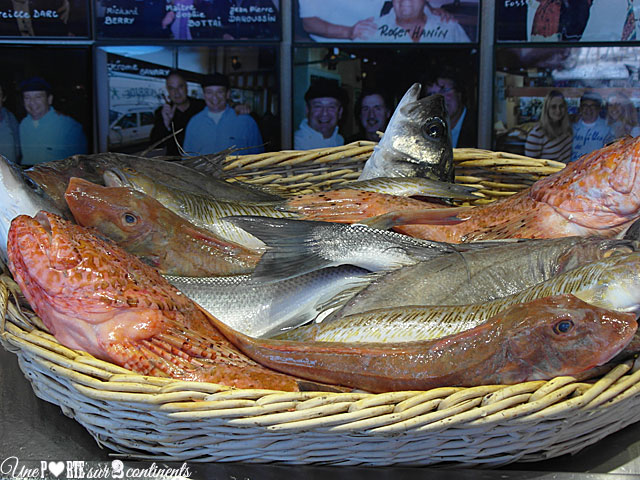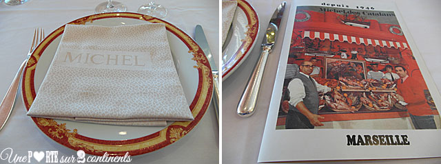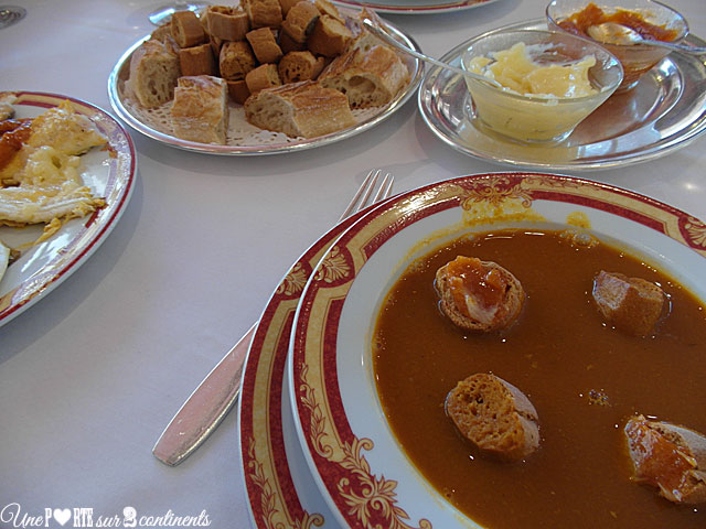 Tout commence par la présentation des poissons qui composeront notre bouillabaisse, dont certains frétillent encore, gage de fraîcheur ! On a déjà l’eau à la bouche en voyant rascasse, St-Pierre et autre espèces défiler sous nos yeux. Le bouillon nous est ensuite servi avec des croûtons ainsi que des bols de rouille et d’aïoli. Puis, deux serveurs élégamment habillés s’installent près de notre table pour dresser nos assiettes. La dégustation peut alors commencer…