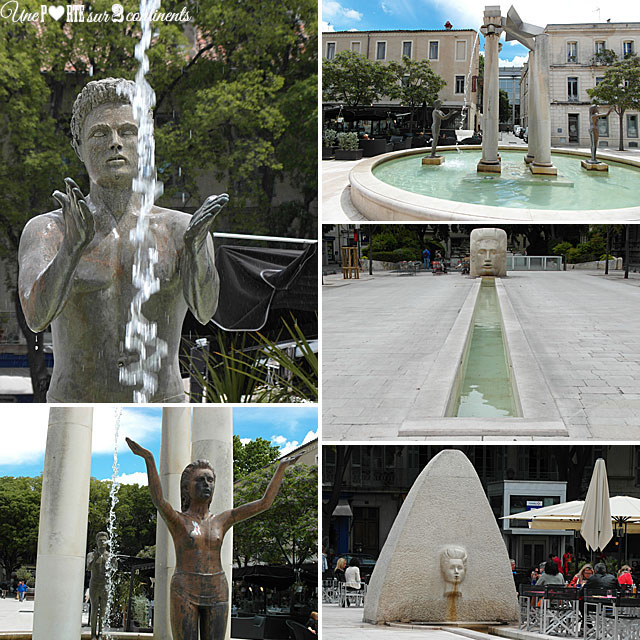 Entre les quais de la Fontaine et la Maison Carrée se trouve ma place préférée de Nîmes qui vaut absolument le détour. J’adore l’aspect mystérieux et plein d’allégresse de cette place avec ses fontaines à tête humaine et son bassin circulaire où se dressent deux statues représentant Nemausa et Nemausus imaginées par Martial Raysse en 1989. Un bel hommage à l’eau si importante dans l’histoire de Nîmes !
