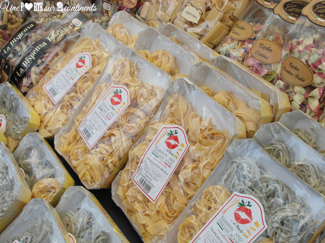 On y trouve un peu de tout, du fromage aux fruits et légumes, avec par exemple les belles variétés de tomates et les fleurs de courgettes, bien associées à l’Italie. Les pâtes sont également à l’honneur, de toutes les couleurs et saveurs possibles, mais aussi les accessoires de cuisine et les t-shirts à l’effigie de Rome.