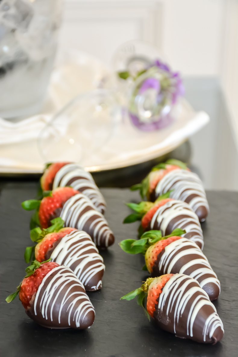 En guise de cadeau de bienvenue, une bouteille de champagne Jacquart et des fraises trempées dans le chocolat m’attendaient sur la table, aux côtés d’un resplendissant bouquet de tulipes jaunes et rouges. Une belle attention qui représente bien l’accueil aimable propre au Sloane Club.