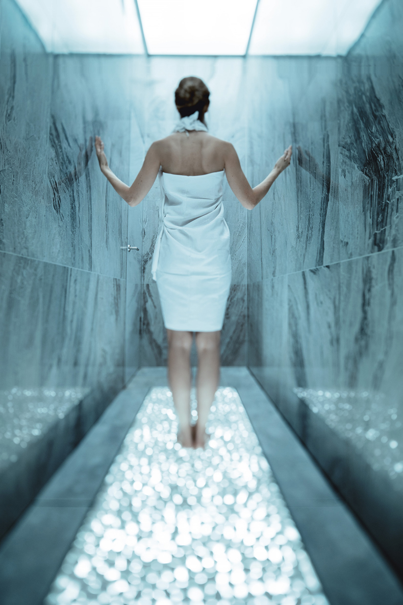 J’ai eu le plaisir de le tester en couple avec mon mari ; un rituel qui se fait très bien à deux, guidé par deux charmantes thérapeutes pendant près de 2h30. Il débute dans la chambre des sens qui porte bien son nom : l’ouïe, le toucher, la vue et l’odorat étant sollicités. C’est là que nous sommes invités à choisir la couleur (une par couple) qui teintera le rituel, mais aussi l’odeur (une par personne) qui l’accompagnera parmi les huiles et autres parfums proposés, avant de traverser un couloir de pluie extrêmement délassant. Ce passage vise d’ailleurs à lâcher prise de tous nos soucis grâce aux propriétés curatives et libératrices de l’eau thermale qui coule sur notre corps.
