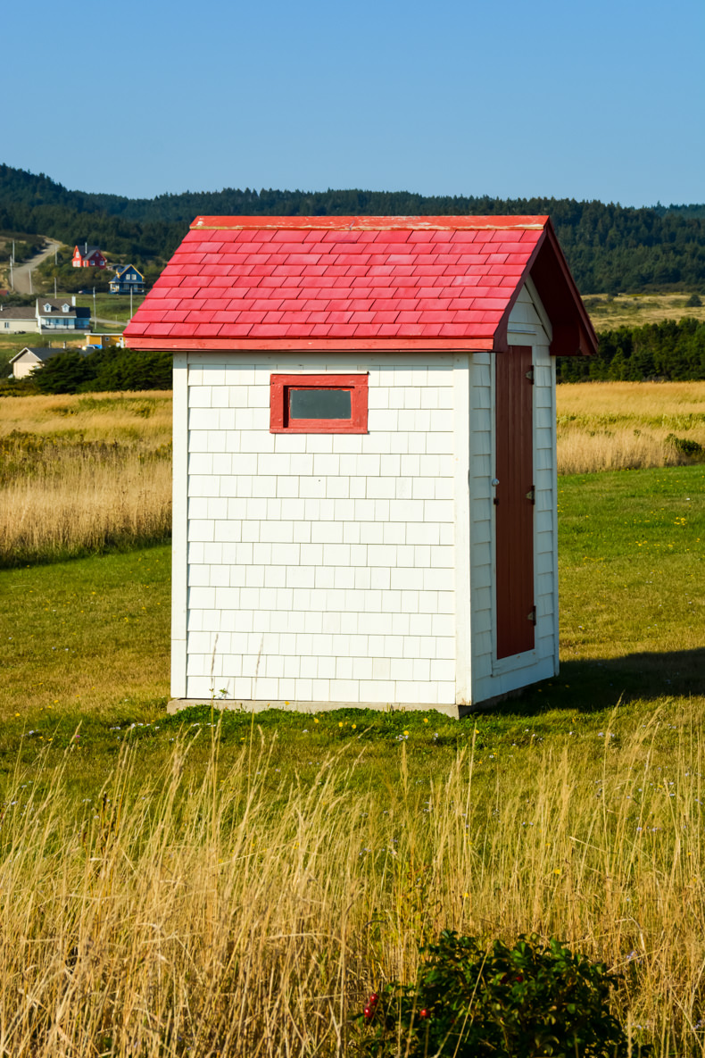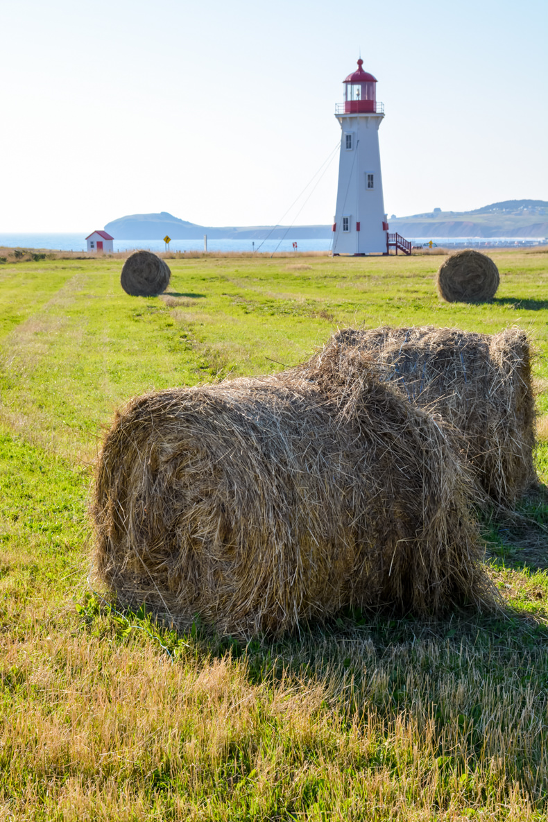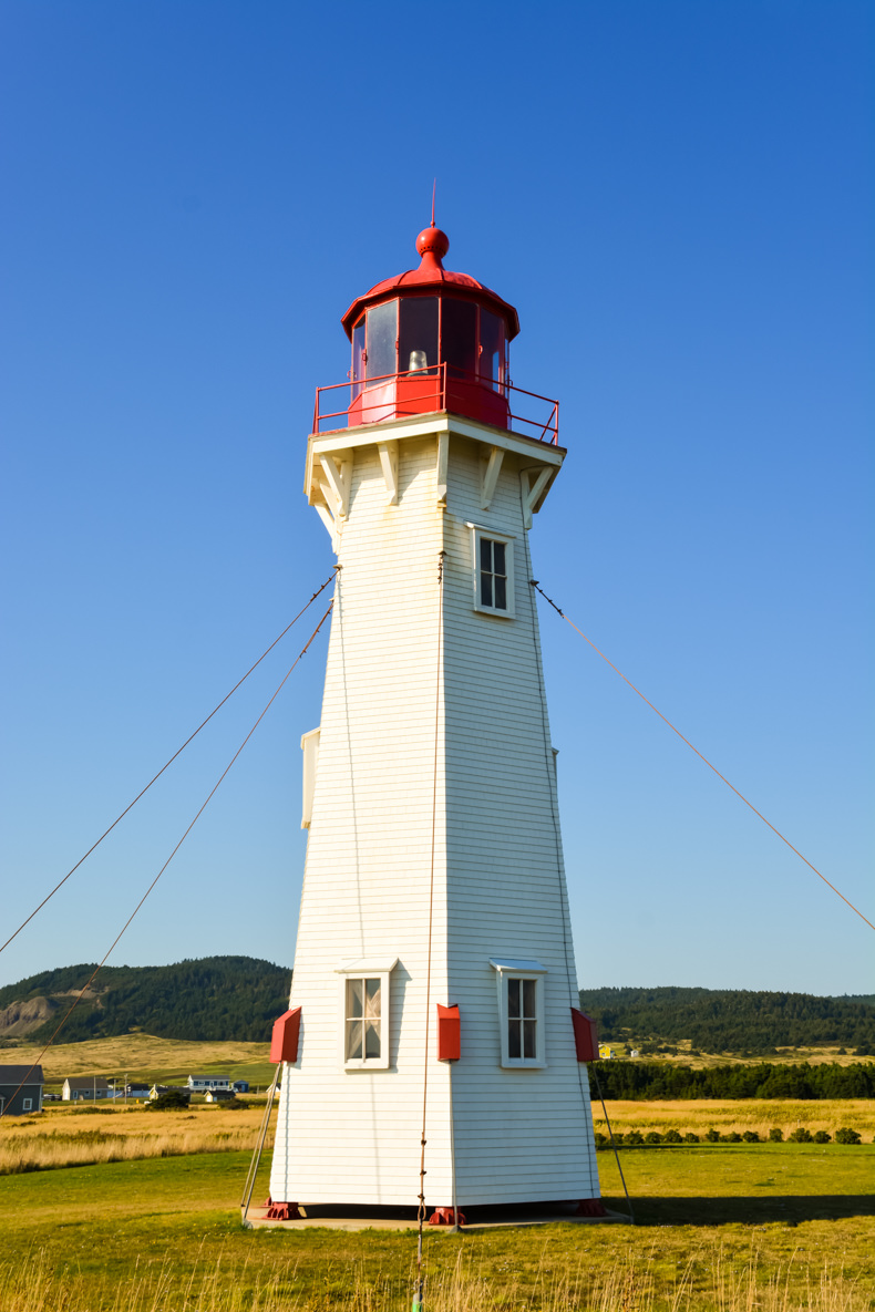 Son cadre est pour le moins bucolique avec les rouleaux de foin dans le champ qui l’entoure et les petites maisons colorées en arrière-plan. Doyen des phares des Iles de la Madeleine, il semble pourtant tout frais avec le rouge vif de sa toiture qui tranche si bien avec le bleu éclatant du ciel.