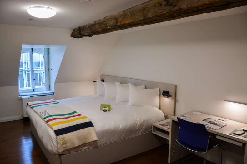 Merveilleusement restauré en mettant en valeur l’héritage unique des lieux, le Monastère des Augustines propose une magnifique harmonie entre l’ancien et le moderne. C’est d’ailleurs très émouvant de se promener dans ses couloirs tout en contemplant les vieilles poutres et portes, dont celle d’entrée à l’origine avec son tour où beaucoup de bébés furent abandonnés aux bons soins des sœurs qui vivaient cloîtrées jusque dans les années 1960. En même temps, les ajouts contemporains se fondent bien au décor, réinventant les espaces pour qu’ils soient adaptés au confort moderne.