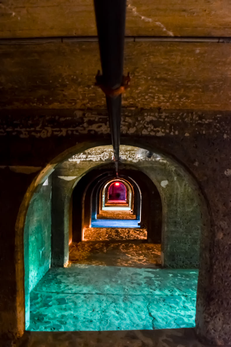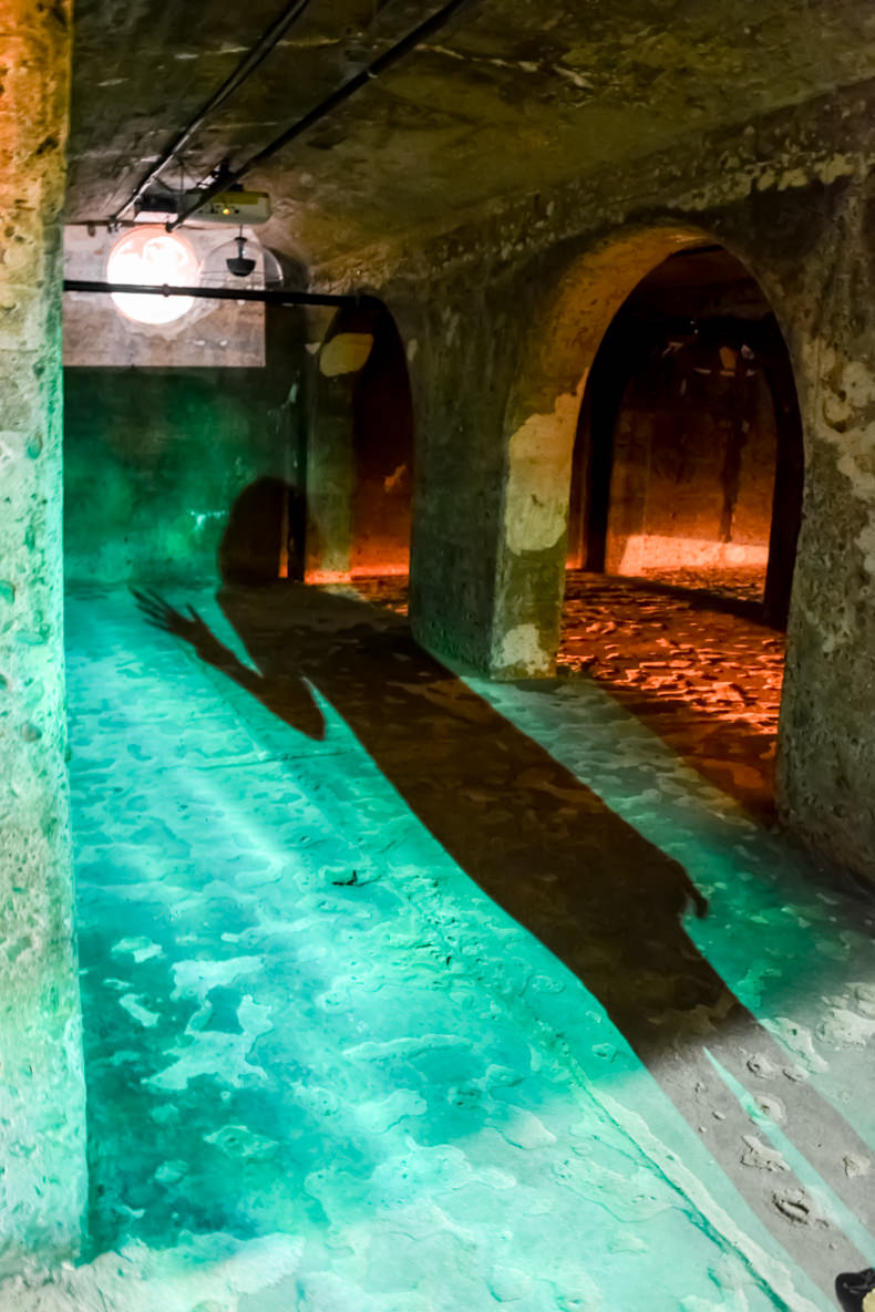 Puis, pour terminer en beauté, la visite se conclut dans les voûtes souterraines. Un espace mystérieux et magique tout illuminé avec un éclairage changeant et des projections vidéo. Il m’a évoqué l’égout collecteur du Musée Pointe-à-Callière de Montréal que l’on peut emprunter tout en vivant une expérience multi-sensorielle et réflexive.