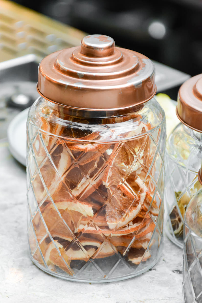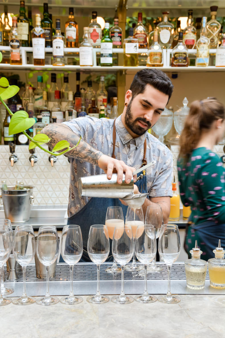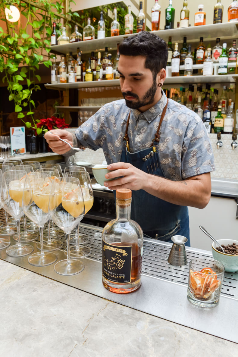 Pour donner l’impression d’être à l’extérieur, l’organique est intégré à l’espace dominé par le blanc avec plusieurs plantes suspendues et même un arbre qui contribue à cette illusion. C’est un peu comme si on était dans une serre avec la verrière qui fait entrer beaucoup de lumière, apportant en même temps une identité singulière au restaurant. Un cadre élégant et stylisé évoquant les tropiques, parfait pour accueillir un cocktail-atelier aux bonnes saveurs de la Guadeloupe.