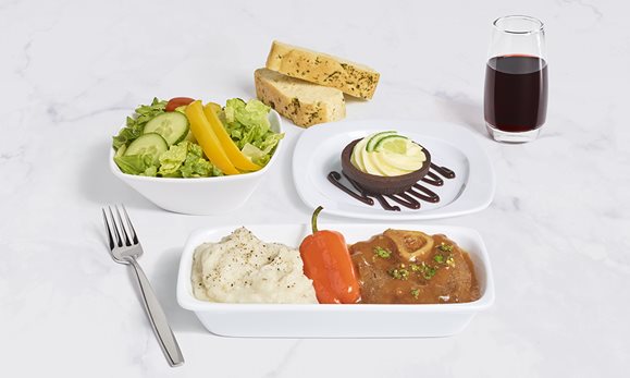 Même si j’apprécie en général les plateaux-repas offerts dans la classe Économie d’Air Transat, j’ai trouvé ceux servis dans la Classe Club bien meilleurs. Au menu lors de mon vol, un choix de 3 repas qui célèbrent les vacances, chacun composé d’une entrée, d’un plat principal, d’un dessert et d’une boisson. Entre l’Osso bucco, le coq au vin et les raviolis de courge musquée, j’ai opté pour cette dernière option que j’ai trouvé délicieuse.